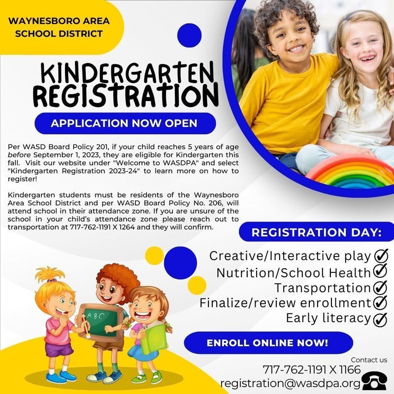 Kindergarten students must be residents of the Waynesboro Area School District and per WASD Board Policy No. 206, will attend school in their attendance zone. If you are unsure of the school in your child’s attendance zone please reach out to transportation at 717-762-1191 X 1264 and they will confirm.